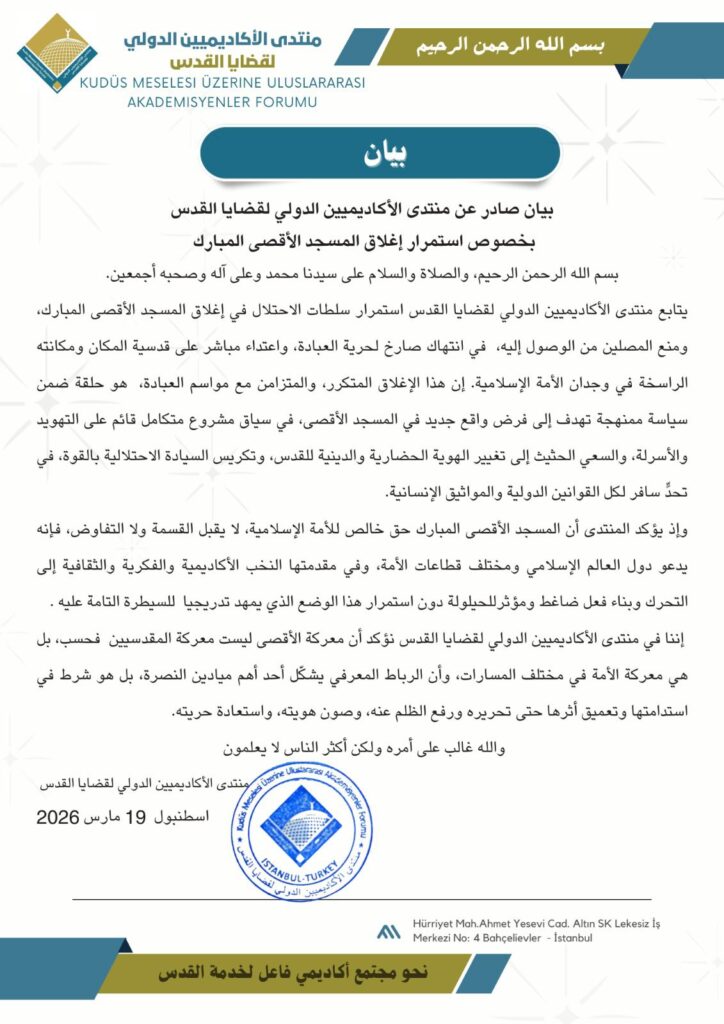 يتابع منتدى الأكاديميين الدولي لقضايا القدس استمرار سلطات الاحتلال في إغلاق المسجد الأقصى المبارك، ومنع المصلين من الوصول إليه، في انتهاك صارخ لحرية العبادة، واعتداء مباشر على قدسية المكان ومكانته الراسخة في وجدان الأمة الإسلامية. إن هذا الإغلاق المتكرر، والمتزامن مع مواسم العبادة، هو حلقة ضمن سياسة ممنهجة تهدف إلى فرض واقع جديد في المسجد الأقصى، في سياق مشروع متكامل قائم على التهويد والأسرلة، والسعي الحثيث إلى تغيير الهوية الحضارية والدينية للقدس، وتكريس السيادة الاحتلالية بالقوة، في تحدٍ سافر لكل القوانين الدولية والمواثيق الإنسانية.