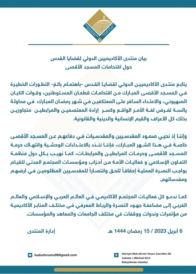 يتابع منتدى الأكاديميين الدولي لقضايا القدس -باهتمام بالغ- التطورات الخطيرة في المسجد الأقصى المبارك من اقتحامات قطعان المستوطنين، وقوات الكيان الصهيوني، والاعتداء السافر على المعتكفين في شهر رمضان المبارك في محاولة يائسة لفرض لغة الأمر الواقع وكسر إرادة المعتصمين والمرابطين متجاوزين بذلك كل الأعراف والقيم الإنسانية والدينية والقانونية .