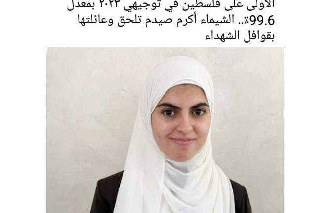 في ضجة الأخبار التي تتوارد عن الإبادة في غزة، يمر خبر استشهاد شيماء وعائلتها في منطقة النصيرات في قطاع غزة، وكأن شيئا لم يحدث، وكأنها مجرد رقم أضيف لقائمة الأرقام. حصلت شيماء أكرم صيدم على معدل 99.6% بامتحان الثانوية العامة لعام 2023، وهذا منحها لقب الأولى بالفرع الأدبي على مستوى فلسطين. بعد ذلك التحقت بالجامعة الإٍسلامية تخصص اللغة الإنجليزية.