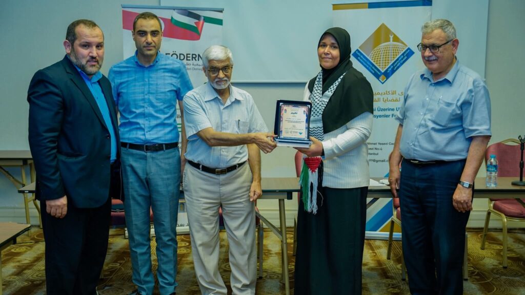 وتخللت الندوة لحظة وفاء وتقدير، تم خلالها تكريم ثلة من طلبة الدكتوراه الذين ناقشوا أطروحاتهم العلمية خلال معركة طوفان الأقصى، وذلك اعترافًا بإسهاماتهم المعرفية في خدمة القضية الفلسطينية وتعزيز حضورها في المحافل الأكاديمية.